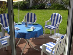 Vom Wohnzimmer kommen Sie zu der sich anschliessenden Terasse mit Garten. Für einen kurzweiligen Urlaubsabend stehen Terassenmöbel und ein Grill bereit. Daneben sind im Erdgeschoss ein Gäste-WC sowie ein Hauswirtschaftsraum mit einer Waschmaschine vorhanden.